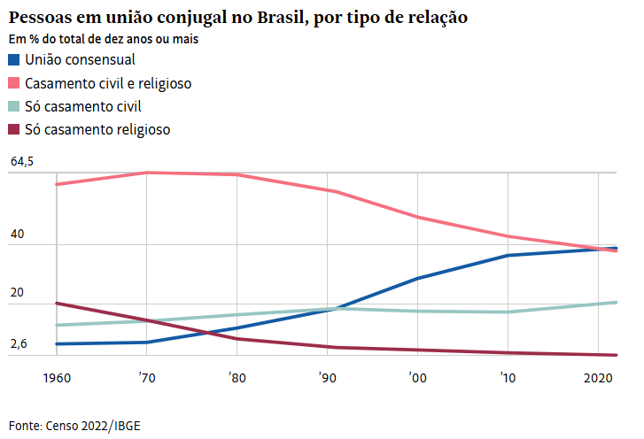 As chamadas uniões consensuais — quando duas pessoas moram juntas com ou sem registro em cartório — já representam 39% das relações conjugais, superando os 38% dos casamentos civil e religioso.