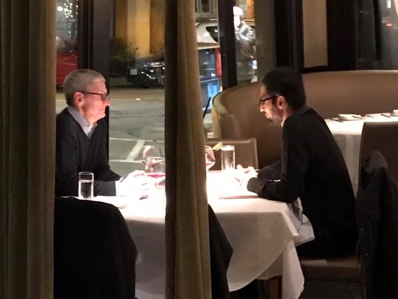 A foto é de 2017, mas é possível que um jantar como esse — entre CEOs de Google e Apple — tenha acontecido de novo nos últimos dias. Isso porque as companhias estão prestes a fechar um deal bilionário para a Siri ser alimentada pelo Gemini.