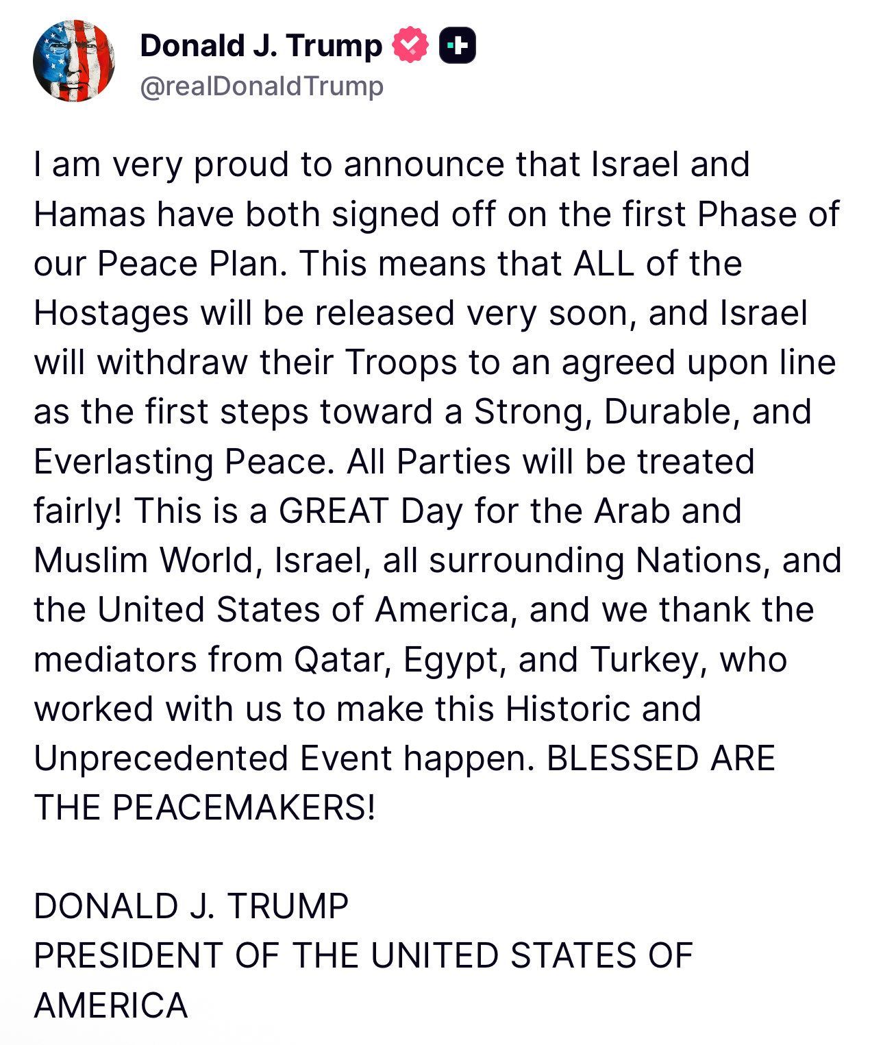 Um post que pode ficar na história. Na noite de ontem, Donald Trump publicou em suas redes sociais que Israel e Hamas assinaram a primeira fase do acordo de paz mediado pelos Estados Unidos.