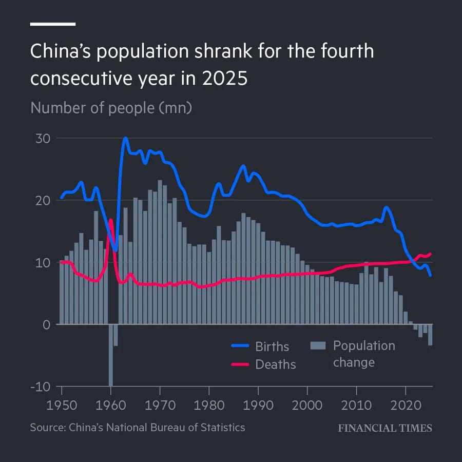 "Um inverno demográfico". Pelo quarto ano consecutivo, a população da China encolheu, registrando apenas 7,92 milhões de nascimentos em 2025 — uma queda livre de 17% em relação ao ano anterior e o pior nível desde 1949.