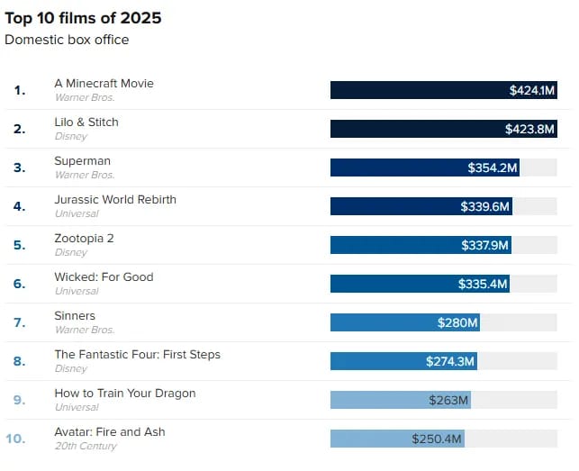 Na prática, o estúdio faturou US$ 2,49 bilhões apenas na América do Norte. O valor isolou a empresa na liderança, bem à frente dos US$ 1,9 bilhão da Warner Bros. e os US$ 1,7 bilhão da Universal.
