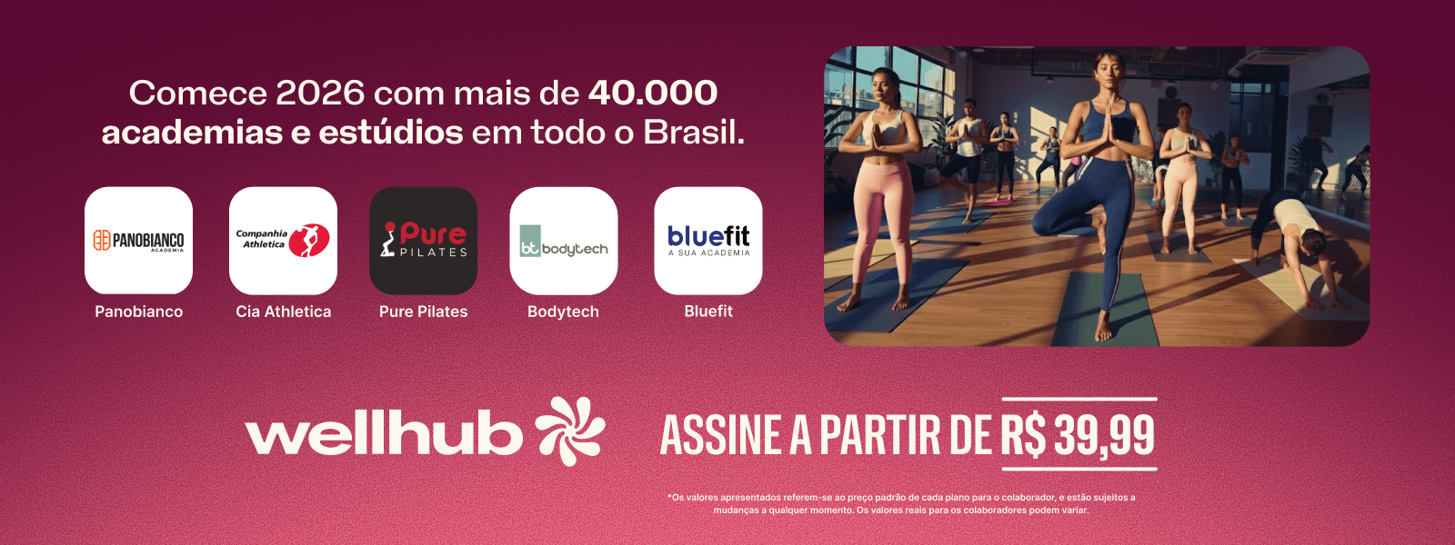 Então, se você é elegível ao benefício pela sua empresa, o Wellhub te ajuda a começar sua rotina de treinos com acesso a mais de 40 mil academias, estúdios e apps, em planos a partir de R$ 39,99.
