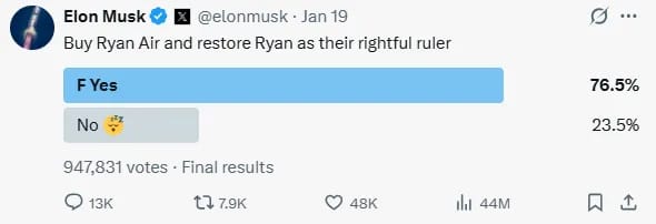 O Musk parece que gostou da ideia e respondeu a um post da Ryanair escrevendo: “Quanto custaria comprar você? Eu realmente quero colocar um Ryan como presidente da Ryanair. É o seu destino.” Na sequência, ele soltou a seguinte enquete: