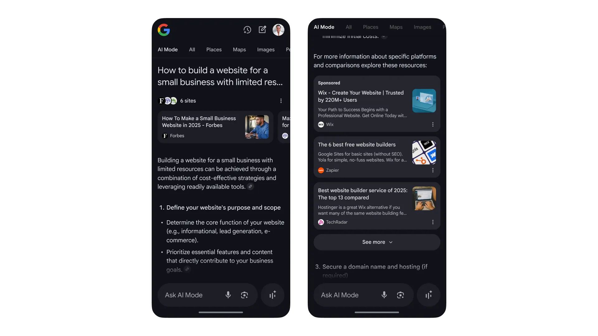 Durante a última semana, usuários nos EUA começaram a ver os primeiros anúncios dentro do AI Mode, o modo conversacional do Google que funciona como um “ChatGPT embutido” no próprio buscador.
