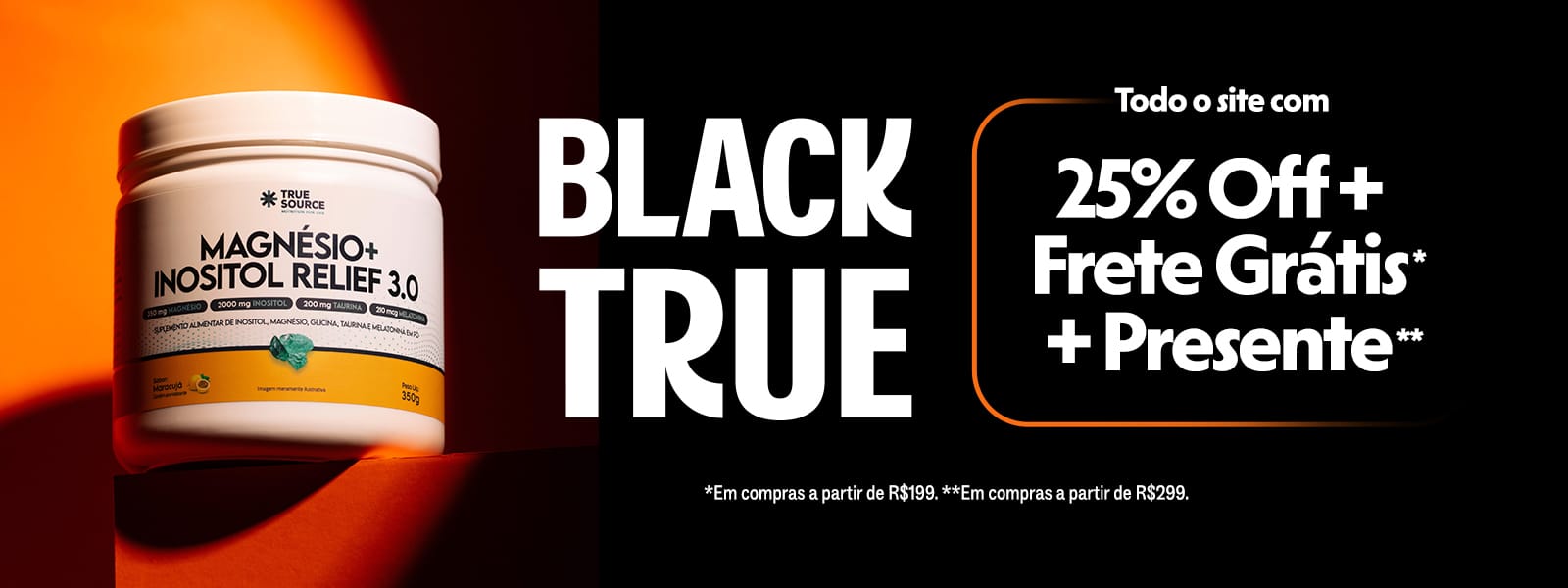 A TRUE abriu a Black com 25% OFF no site inteiro e frete grátis nas compras a partir de R$199 e isso inclui o queridinho do momento: o Magnésio + Inositol Relief 3.0, o único magnésio testado cientificamente da categoria.