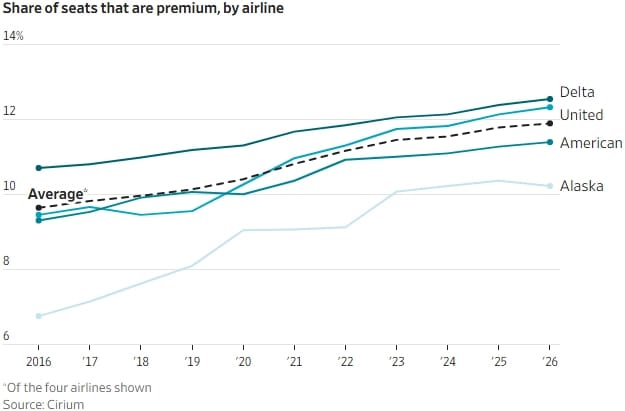 Inclusive, essa tendência está fazendo muitas empresas aumentarem a quantidade de assentos premium nas suas aeronaves. No fim, essa diversidade de poltronas é uma resposta para as crises que sempre batem na porta do setor. | ![]() (Imagem: Wall Street Journal) |