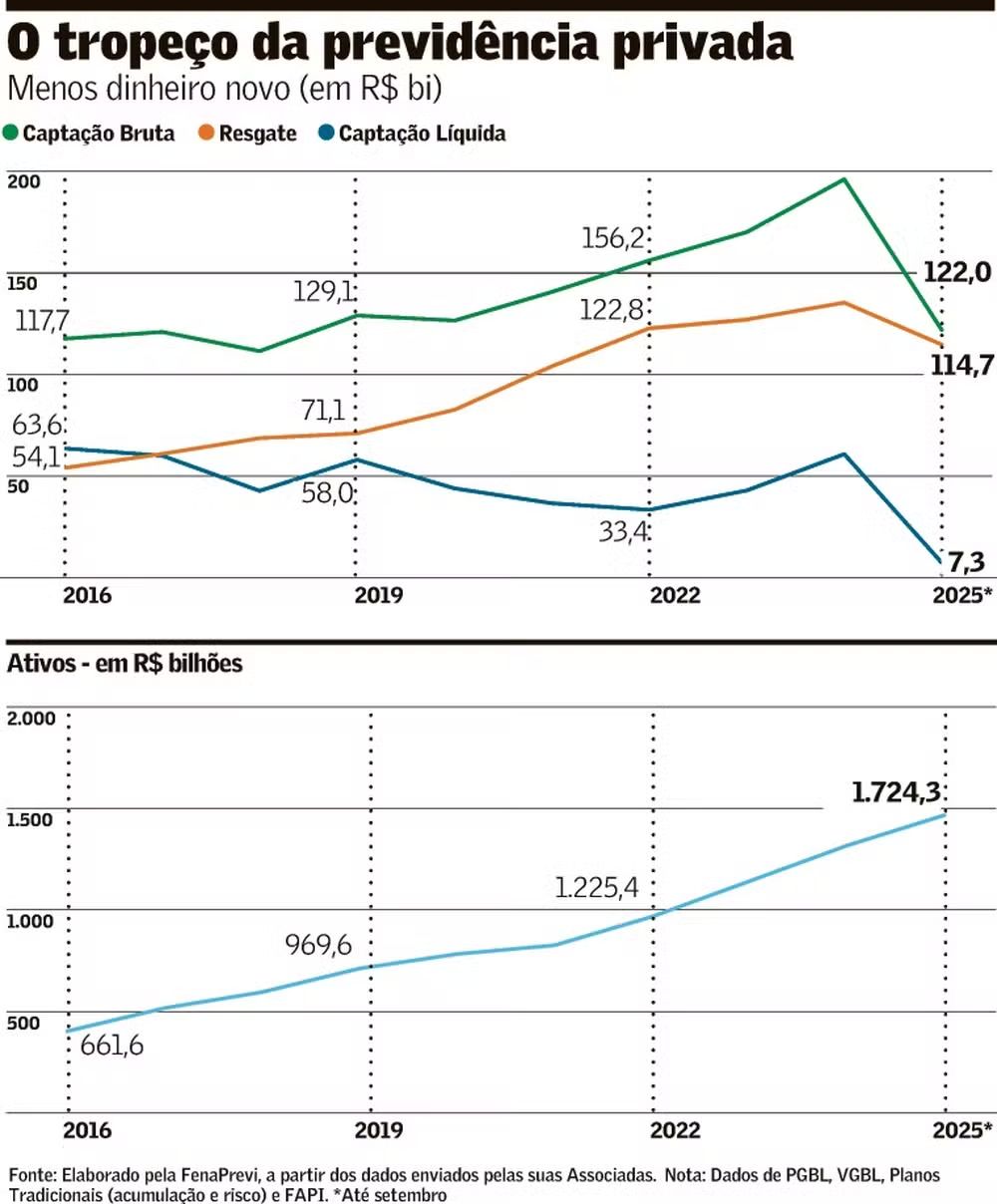 A previdência privada, considerada a “caixinha do futuro” para muitos brasileiros, corre o risco de fechar 2025 no negativo pela primeira vez na história.