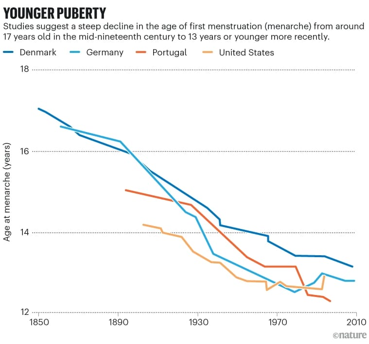 A idade em que as meninas iniciam a puberdade caiu drasticamente. Agora, a ciência está correndo contra o relógio para entender o porquê. Se na década de 1840 a primeira menstruação ocorria aos 17 anos, hoje, ela acontece em torno dos 12. O desenvolvimento das mamas, que nos anos 60 começava aos 11, agora ocorre entre os 9 e 10 anos — com casos cada vez mais comuns de meninas de 8 anos já apresentando sinais. | ![]() (Imagem: Nature) |