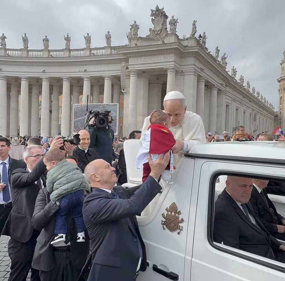 Paulo, um bebê brasileiro de quatro meses, recebendo a bênção do papa Leão XIV no Vaticano. (Imagem: Matheus Bortone | Reprodução)
