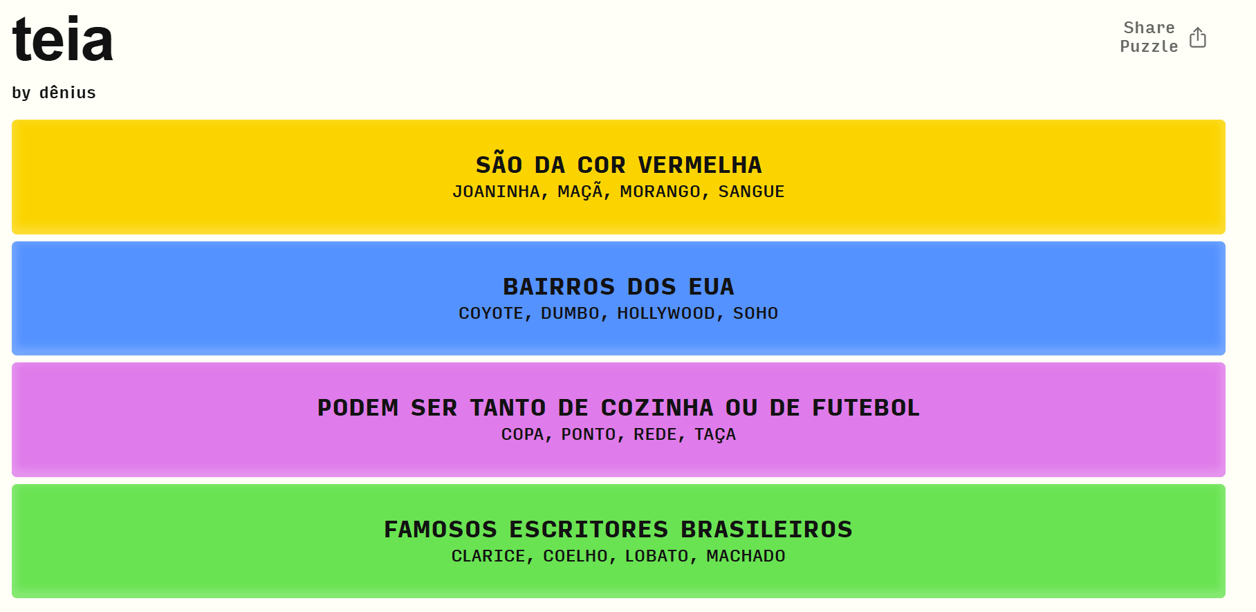 Como muitas corujas noturnas pediram, aqui está o gabarito do teia de ontem. E conforme a tradição, clicando na imagem, já está disponível o jogo de hoje.