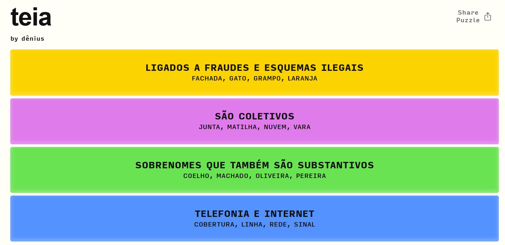 Para as corujas de plantão, tem mais um teia saindo. Tente descobrir qual a conexão entre as palavras e a qual grupo elas pertencem. Clique na imagem abaixo e let’s go.
